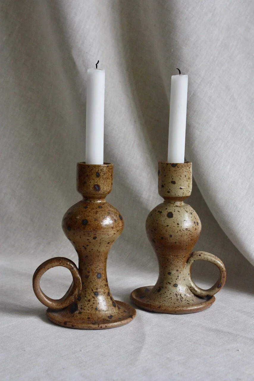 Two stoneware candlesticks by French studio potter, Michel Dumont, from Saint-Amand-en-Puisaye, circa 1960s.